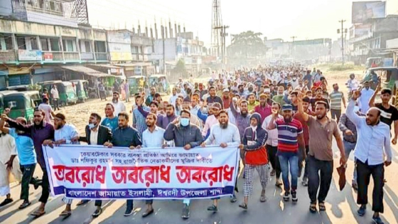 কয়েকজন প্রত্যক্ষদর্শী জানান, সকাল আনুমানিক সাড়ে ছয়টার দিকে ২০ থেকে ২৫ জন যুবক হাতে লাঠি ধারালো অস্ত্রসহ রেলগেট এলাকায় এসে অবরোধের স্লোগান দেয়। এ সময় অবরোধকারীরা রেলগেট আইল্যান্ডের সঙ্গে সাঁটানো স্থানীয় এমপি বীর মুক্তিযোদ্ধা নুরুজ্জামান বিশ্বাসসহ বেশ কয়েকজন আওয়ামী নেতার টাঙানো শুভেচ্ছাসংবলিত কাঠের ব্যানার-পোস্টারে আগুনে পুড়িয়ে দেয় এবং রাস্তায় টায়ার জ্বালিয়ে দেয়। খবর পেয়ে টহলে থাকা পুলিশ ভ্যান ছুটে এলে অবরোধকারীরা রেলগেট হয়ে বাজারের দিকে চলে যায়।