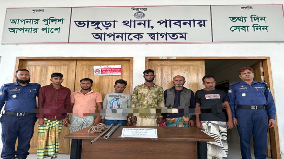 পাবনার ভাঙ্গুড়ায় ডাকাতি করে পালানোর সময় ডাকাত দলের ৬ সদস্যকে আটক করেছে পুলিশ। এ সময় তাদের কাছ থেকে কয়েকটি ধারাল অস্ত্র, দড়ি ও ডাকাতি করে নিয়ে যাওয়ার চেষ্টাকালে একটি মিনি পিকআপ (ঢাকা মেট্রো-ন ১৩-৭৯০৯) জব্দ করা হয়। সোমবার (২০ নভেম্বর) ভোর রাতে টেবুনিয়া-বাঘাবাড়ি মিনি বিশ্বরোডের ভাঙ্গুড়া উপজেলার ভেড়ামারা এলাকায় এ ঘটনা ঘটে। আটকরা হলো হাশেম আলী, রাশেদুল ইসলাম, লিটন আহমেদ, আলম হোসেন ও বাবু সরকার। তারা সিরাজগঞ্জের শাহজাদপুর থানার বাঘাবাড়ি পশ্চিমপাড়া গ্রামের বাসিন্দা। অপর ব্যক্তির নাম মনিরুল ইসলাম। তিনি পাবনার সাঁথিয়া উপজেলার সিলন্দা গ্রামের বাসিন্দা।