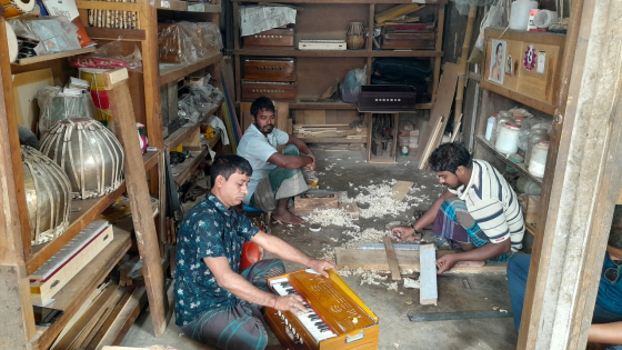 উজ্জ্বল সিংহের দোকানে গিয়ে দেখা যায়, চারজন কারিগর সকাল থেকে দিনরাত কাজ করছেন। কেউ হারমোনিয়াম, কেউ তবলা, কেউ ঢোল তৈরি করছেন।