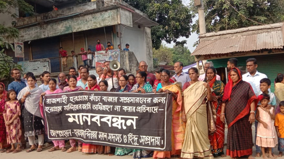 মানববন্ধনে জানানো হয়, হরগ্রাম এলাকায় শ্রী শ্রী রাধিকা নাথেশ্বর শিব ঠাকুর, শ্রী শ্রী মদন গোপাল দেব ঠাকুর মন্দির ও রাধা গোবিন্দ মন্দির নামে তিনটি মন্দির রয়েছে। জমিদার জিতেন্দ্র নাথ ভাদুড়ী ১৪ কাঠা জমি এই মন্দিরকে দান করেছিলেন। মন্দিরের নামে থাকা এই ১৪ কাঠা জমির মধ্যে ৪ কাঠা জমি অধিগ্রহণ করে হরগ্রাম সবজির বাজার সম্প্রসারণের সিদ্ধান্ত নিয়েছে রাজশাহী সিটি করপোরেশন। এই জমি অধিগ্রহণ করা হলে এই এলাকার হিন্দু ধর্মাবলম্বীদের উপাসনায় ব্যাঘাত ঘটবে।