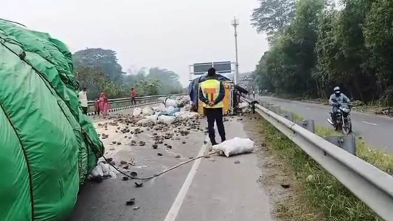 শিবচর হাইওয়ে থানা ও স্থানীয় সূত্রে জানা গেছে, এক্সপ্রেসওয়ের ভাঙ্গা থেকে ঢাকাগামী লেনে সকালে একটি বিকল পণ্যবাহী ট্রাকের পেছনে ঢাকাগামী অপর একটি ট্রাক ধাক্কা দেয়। এ সময় দুটি ট্রাকটি ছিটকে সড়কের ওপর উল্টে পড়ে। তবে কোনো ট্রাকেরই কেউ হতাহত হয়নি। ঘটনার পরপরই চালক, হেলপার গা ঢাকা দেয়। খবর পেয়ে হাইওয়ে পুলিশ এসে মহাসড়ক থেকে দুর্ঘটনাকবলিত ট্রাক দুটি সরিয়ে যানবাহন চলাচলে স্বাভাবিক করে।
