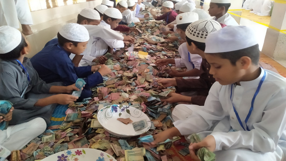 মসজিদের মেঝেতে ঢেলে মাদ্রাসার ১৩৪ জন ছাত্র, ১০ জন শিক্ষক, রূপালী ব্যাংকের ৬০ জন কর্মকর্তা, ১০ জন আনসার সদস্য টাকাগুলো গণনা করছেন। দিনভর গণনা শেষে রাতে টাকার পরিমাণ জানা যাবে।