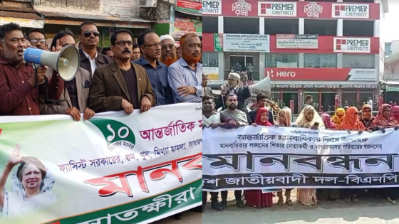 আন্তর্জাতিক মানবাধিকার দিবস উপলক্ষে গুম, খুন ও হত্যার প্রতিবাদে এবং আওয়ামী লীগের নির্বাচন কমিশনের একতরফা তপশিল বাতিল ও সরকারের পদত্যাগসহ গণতন্ত্র পুনঃপ্রতিষ্ঠার একদফা দাবিতে সাতক্ষীরায় বিএনপির দুই গ্রুপের পাল্টাপাল্টি মানববন্ধন কর্মসূচি পালিত হয়েছে।