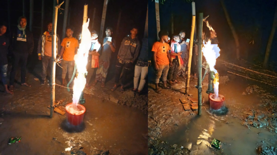 রোববার (১৭ ডিসেম্বর) দিবাগত রাত ১০টায় ঘটনাস্থলে গিয়ে দেখা যায় উৎসুক লোকজনের ভিড়। পাশেই সদ্য বসানো টিউবওয়েল থেকে আপনাআপনি পানি এবং স্বশব্দে গ্যাস বেরুচ্ছে। লোকজন টিউবওয়েলের গ্যাসে আগুন ধরিয়ে দিলে অনর্গল জ্বলতে থাকে।
