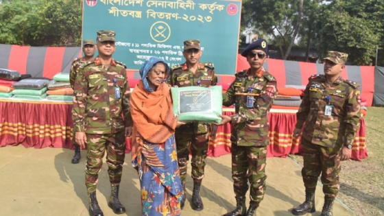 নাটোরের সিংড়া উপজেলার চৌগ্রাম উচ্চ বিদ্যালয় ও কলেজ মাঠে শীতার্ত ৬০০ মানুষের মধ্যে কম্বল বিতরণ করেছে সেনাবাহিনীর ১১ পদাতিক ডিভিশন ও ২৬ পদাতিক ব্রিগেডের ১৭ ইস্ট বেঙ্গল রেজিমেন্ট।