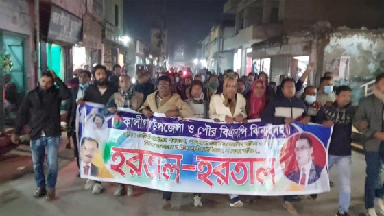 বিএনপির ডাকা সকাল সন্ধ্যা হরতাল সফলে ঝিনাইদহের কালীগঞ্জে বিক্ষোভ মিছিল করেছে বিএনপির নেতাকর্মীরা। সোমবার (১৮ ডিসেম্বর) সন্ধ্যায় শহরের হাঁট চাদনী এলাকা থেকে মিছিল বের করা হয়। শহরের গুরুত্বপূর্ণ সড়ক প্রদক্ষিণ শেষে নলডাঙ্গা ভ্যান স্ট্যান্ড এলাকায় গিয়ে শেষ হয় মিছিলটি।