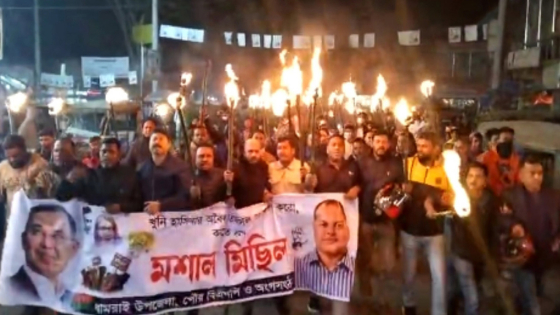 দ্বাদশ জাতীয় সংসদ নির্বাচনের তপশিল বাতিল ও শেখ হাসিনা সরকারের পদত্যাগের দাবিতে ধামরাইয়ে বিএনপির নেতাকর্মীরা মশাল মিছিল করেছে।