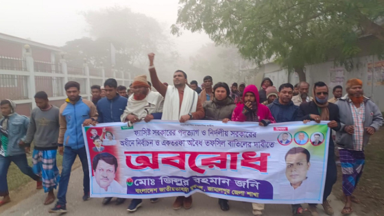 বিএনপির নির্বাহী কমিটির জলবায়ুবিষয়ক সহসম্পাদক মোস্তাফিজুর রহমান বাবুল ও যুবদলের কেন্দ্রীয় সহপাঠাগারবিষয়ক সম্পাদক সাজিদ হাসান বাবুর নির্দেশনায় এই মিছিল হয়েছে। মাদারগঞ্জ উপজেলা বিএনপির আহবায়ক বাবুল খান ও যুগ্ম আহবায়ক মিজানুর রহমান রতন আকন্দের তত্ত্বাবধানে যুবদল নেতা জিল্লুর রহমান জনির নেতৃত্বে অবরোধ সফলে ঢাকা-মাদারগঞ্জ মহাসড়কে মিছিল অনুষ্ঠিত হয়।