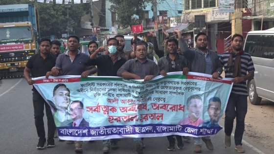 বিএনপির ডাকা ১৩তম দফায় দেশব্যাপী অবরোধ সফলে রোববার (২৪ ডিসেম্বর) দুপুরে বিক্ষোভ মিছিল করেছে রাঙ্গামাটি জেলা ছাত্রদলের নেতাকর্মীরা। দ্বাদশ সংসদ নির্বাচন বর্জন ও অসহযোগ আন্দোলনের জনমত তৈরি এবং নির্দলীয় নিরপেক্ষ সরকারের অধীনে নির্বাচনের একদফা দাবিতে এই মিছিল এই অবরোধ পালন করছে বিএনপিসহ মিত্র দল এবং জোটগুলো।