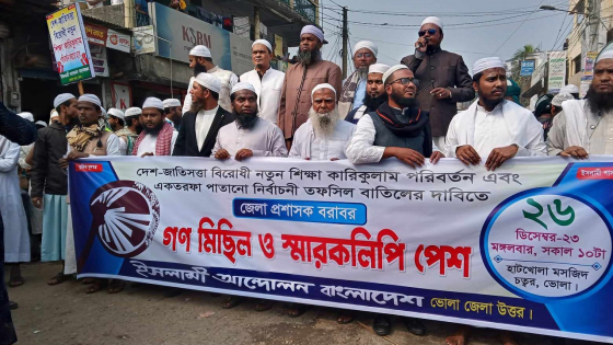 নতুন শিক্ষা কারিকুলাম পরিবর্তন ও নির্বাচনের তপশিল বাতিলের দাবিতে গণমিছিল করেছে ভোলা জেলা ইসলামী আন্দোলন বাংলাদেশ। মঙ্গলবার (২৬ ডিসেম্বর) বেলা ১১টায় এ গণমিছিল অনুষ্ঠিত হয়।