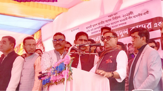 বাংলাদেশ আওয়ামী লীগের সাধারণ সম্পাদক ওবায়দুল কাদের বলেছেন, একটা বড় দল নির্বাচনে আসে নাই। তাই আপনাদের দায়িত্ব বেড়ে গেছে। আপনাদের ভোটকেন্দ্রে আসার জন্য আমাদের নেত্রী শেখ হাসিনার পক্ষ থেকে আহ্বান জানাচ্ছি। কেউ যদি মনে করেন, কেন্দ্রে গিয়ে লাভ নেই, কাদের ভাই তো নির্বাচিত হয়ে গেছে, এটা কেউ মনে করবেন না। এ নির্বাচনে ভোটকেন্দ্রে উপস্থিত থাকা খুবই গুরুত্বপূর্ণ। আমাদের যারা প্রতিপক্ষ, তারা অপপ্রচার চালাচ্ছে যাতে ভোটকেন্দ্রে ভোটাররা না আসতে পারে। তাদের উচিত শিক্ষা দিতে হবে। আমরা দলে দলে ভোটকেন্দ্রে উপস্থিত হয়ে তাদের জবাব দিব। আগামী ৭ জানুয়ারি ফাইনাল খেলা হবে।