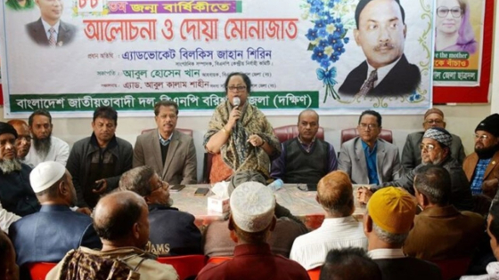 বরিশাল জেলা (দক্ষিণ) বিএনপির আহ্বায়ক আবুল হোসেন খানের সভাপতিত্বে এবং সদস্য নাসির হাওলাদারের সঞ্চালনায় আলোচনা সভা ও দোয়া-মোনাজাত অনুষ্ঠানে প্রধান অতিথির বক্তব্য দেন বিএনপি কেন্দ্রিয় কমিটির বিভাগীয় সাংগঠনিক সম্পাদক সাবেক এমপি বিলকিস জাহান শিরিন।