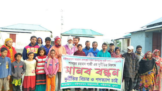 খুলনার পাইকগাছায় আশ্রায়ণ প্রকল্পের সভাপতির বিরুদ্ধে অনিয়ম, দুর্নীতি, স্বেচ্ছাচারিতা, ক্ষমতার অপব্যবহার, হিসাব না দেওয়া ও সমিতির সদস্যদের অবমূল্যায়নের অভিযোগে সাধারণ সদস্য ও আশ্রয়ণের বাসিন্দারা উপজেলা নির্বাহী অফিসার বরাবর অভিযোগ দিয়েছেন এবং সোমবার (২২ জানুয়ারি) বিকেলে মানববন্ধন করে সভাপতির শাস্তি ও পদ থেকে অপসারণের দাবি জানিয়েছেন।