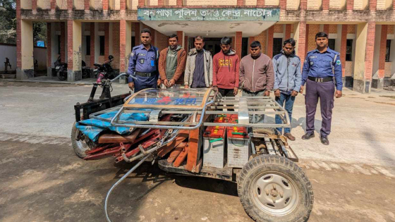 গ্রেপ্তারকৃতরা হলেন পাবনা জেলার ঈশ্বরদী উপজেলার মাঝদিয়া পুরাতন রেললাইন বাজার এলাকার মো. জহুরুল মন্ডল (৪০), নাটোর জেলার লালপুর উপজেলার সাদিপুর সরদারপাড়া এলাকার বাদশা সরদার (৪৫), রাজশাহী জেলার পুঠিয়া উপজেলার ছোট সেনবাগ এলাকার মো. রতন হোসেন (২৮), নাটোর সদরের তেবারিয়া এলাকার সাব্বির হোসেন (২৭) এবং নাটোর জেলার লালপুর উপজেলার ঈশ্বরপাড়া এলাকার রাশিদুল ইসলাম (২৬)। এ সময় তাদের দেওয়া তথ্য মতে খন্ডিত ইজিবাইক ও ব্যাটারিসহ বিভিন্ন যন্ত্রাংশ উদ্ধার করা হয়।