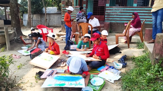 চারদিকে সবুজে ঘেরা প্রকৃতি আর গ্রাম বাংলার অপার সৌন্দর্য। সেই সৌন্দর্যকে রংতুলির আঁচড়ে জীবন্ত করে তুলতে ব্যস্ত খুদে আঁকিয়েরা।