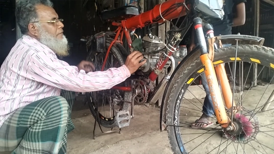 ৬৪ বছরের বৃদ্ধ আব্দুর রাজ্জাক ব্যাপারী, নেই কোনো কারিগরি বা প্রাতিষ্ঠানিক শিক্ষা। তবে ছোটবেলা থেকেই কিছু না কিছু আবিষ্কার তার প্রবল ঝোঁক। যন্ত্রাংশ কিনে রেডিও, বাইসাইকেলে মটর বসিয়ে প্যাডেলবিহীন সাইকেল। সর্বশেষ বাইসাইকেলকে মোটরসাইকেলে রূপান্তর করে সবাইকে তাক লাগিয়ে দিয়েছেন আব্দুর রাজ্জাক।