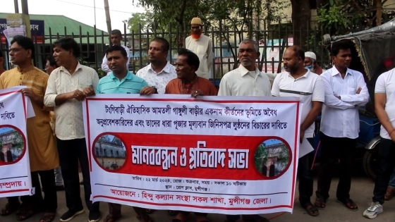 মুন্সিগঞ্জের টঙ্গীবাড়ীতে মন্দিরের জমি বেদখলের অভিযোগ তুলে পুনরুদ্ধারের দাবিতে মানববন্ধন অনুষ্ঠিত হয়েছে।
