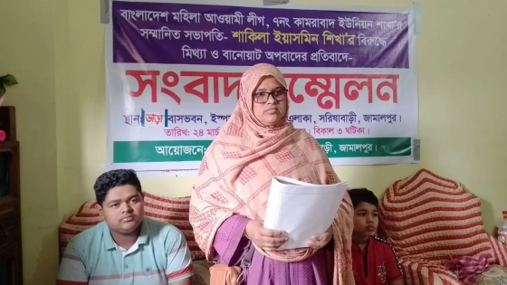 সংবাদ সম্মেলনে স্থানীয় ইউপি সদস্য আলমগীর ও তার সহযোগীদের অভিযুক্ত করেছেন ভুক্তভোগী আ.লীগ নেত্রী শাকিলা ইয়াসমিন শিখা। তিনি ইউনিয়ন মহিলা আ.লীগের সভাপতি।