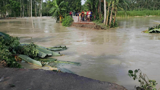 বৃহস্পতিবার রাত সাড়ে ১২টায় উপজেলার বামনডাঙ্গার তেলিয়ানীকুটিতে প্রায় ১৫০ ফুট এবং রাত আড়াইটায় পানাতিটারীতে প্রায় ৪০০ ফুট বন্যা নিয়ন্ত্রণ বাঁধ ভেঙে প্রবল বেগে লোকালয়ে ঢুকছে দুধকুমারের পানি।