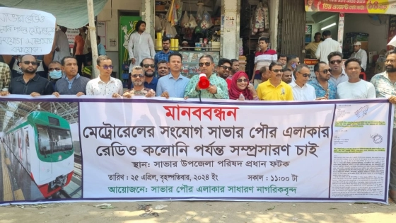 সাভার পৌর এলাকার রেডিও কলোনি/ নবীনগর পর্যন্ত মেট্রোরল প্রকল্প সম্প্রসারণের দাবিতে মানববন্ধন করেছে সাভার পৌর এলাকার বাসিন্দারা।