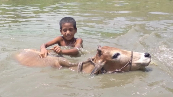 সরেজমিনে দেখা গেছে, উপজেলার মোহনপুর ইউনিয়নের গরু খামারি গোলাবুর রহমান তীব্র দাবদাহ হতে রক্ষা পেতে তার পালিত গরুগুলোকে পুকুরের পানিতে নামিয়ে দিয়েছেন।