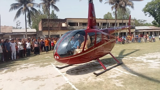 গাইবান্ধার সাদুল্লাপুরে বাবার স্বপ্ন পূরণে হেলিকপ্টার উড়িয়ে কনের বাড়িতে গেলেন বর। বিয়ে করে হেলিকপ্টারে চড়েই নববধূকে বাড়িতে নিয়ে যান বর হযরত আলী।