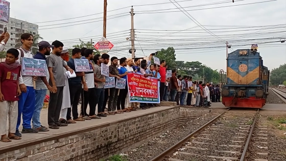 রাজবাড়ী থেকে ছেড়ে আসা ঢাকাগামী ‘চন্দনা কমিউটার’ ট্রেনটির ফরিদপুর রেলস্টেশনে স্টপেজের দাবিতে কাফনের কাপড় পরে ট্রেন অবরোধ করে মানববন্ধন করে এলাকাবাসী।