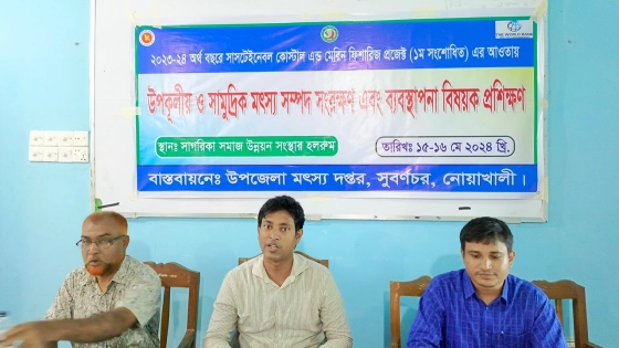 সাসটেইনেবল কোস্টাল এন্ড মেরিন ফিসারিজ প্রজেক্টের আওতায় নোয়াখালীর সুবর্ণচরে উপকূলীয় ও সামুদ্রিক মৎস্য সম্পদ সংরক্ষণ এবং ব্যবস্থাপনা বিষয়ক দুই দিনব্যাপী প্রশিক্ষণ অনুষ্ঠিত হয়েছে