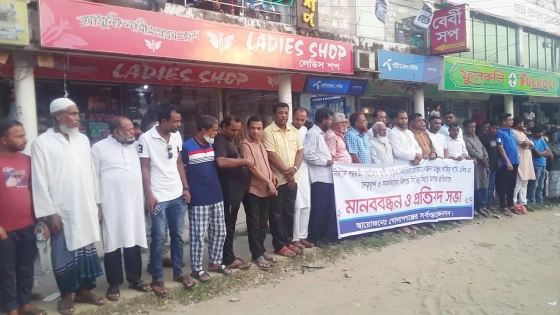 এর আগে স্থানীয় খারকানা বাজারসহ বিভিন্ন এলাকা থেকে খণ্ড খণ্ড মিছিল নিয়ে মানববন্ধনে অংশ নেয় কয়েকশ মানুষ।