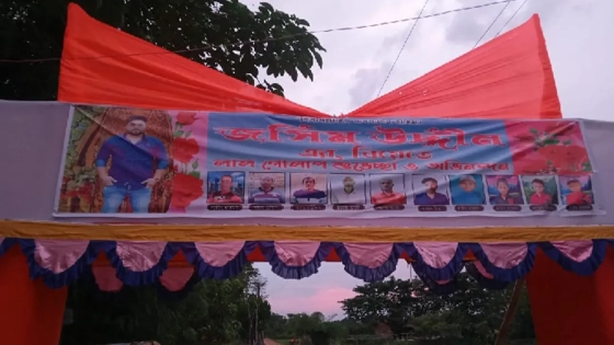 আসামির বিয়ে, তবুও পুলিশের খবর নেই। বরং ঢাকঢোল পিটিয়ে মহাসমারোহে চলছে বিয়ের আয়োজন। বরকে শুভেচ্ছা জানিয়ে নির্মাণ করা হয়েছে বিশাল তোরণ।