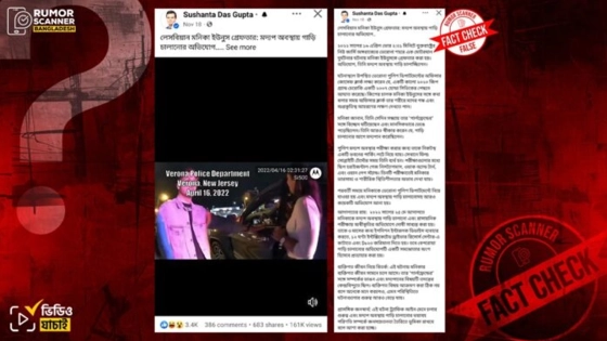 সংস্থাটি আরও জানায়, অনুসন্ধানে প্রচারিত ভিডিওটির একাধিক কি-ফ্রেম রিভার্স ইমেজ সার্চ করে ‘Transparency Bodycam’ নামের একটি ইউটিউব চ্যানেল খুঁজে পাওয়া যায়। সেখানে চলতি বছরের গত ২৮ আগস্ট ‘Drunk Woman Crashes her Car After a Breakup in Verona, New Jersey’ শিরোনামে প্রকাশিত একটি ভিডিও পাওয়া যায়। ওই ভিডিওটির শুরু থেকে প্রথম দিককার কিছু অংশের সঙ্গে প্রচারিত ভিডিওটির হুবহু সাদৃশ্য পাওয়া যায়।