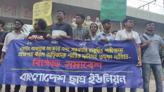 কোটা ব্যবস্থার সংস্কার এবং সরকারি চাকরির পরীক্ষার প্রশ্নপত্র ফাঁসে জড়িতদের শাস্তি ও ফাঁস করা প্রশ্নে নিয়োগপ্রাপ্তদের প্রমাণসাপেক্ষে চাকরিচ্যুত করে শাস্তির দাবিতে বিক্ষোভ সমাবেশ করেছে বাংলাদেশ ছাত্র ইউনিয়ন।