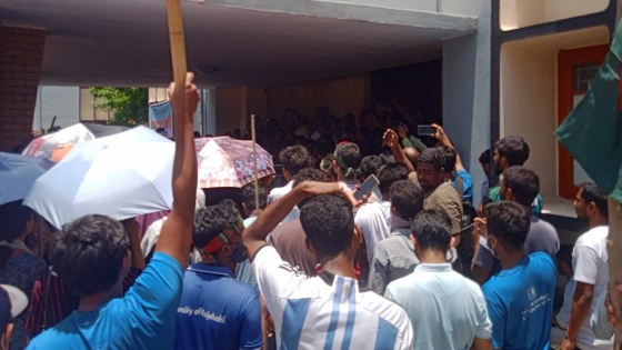বুধবার (১৭ জুলাই) বেলা সাড়ে ১১টায় তারা প্রশাসনিক ভবনের সামনে এসে বিভিন্ন স্লোগান দিতে থাকেন। এ সময় আন্দোলনকারী শিক্ষার্থীদের হাতে হাতে লাঠিসোঁটা দেখা গেছে।