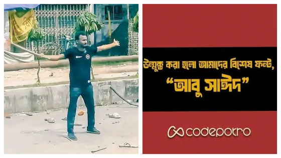 কোটা আন্দোলনে গুলিবিদ্ধ হয়ে নিহত বেগম রোকেয়া বিশ্ববিদ্যালয়ের (বেরোবি) শিক্ষার্থী আবু সাঈদের নামে নতুন বাংলা ফন্ট উন্মুক্ত করেছে কোড পোট্রো। এমন একটি পোস্ট সামাজিক যোগাযোগমাধ্যমে শেয়ার করেছেন আবু সাঈদের সহপাঠী ও বিভিন্ন বিশ্ববিদ্যালয়ের শিক্ষার্থীরা।