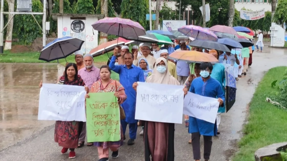 বিশ্ববিদ্যালয়ের একাধিক সূত্র জানায়, শিক্ষকরা বৃষ্টির মধ্যেই প্ল্যাকার্ড হাতে লাইব্রেরির সামনে থেকে একটি মিছিল বের করেন। মিছিলটি বিশ্ববিদ্যালয়ের বিজয়-৭১ স্মৃতিস্তম্ভের সামনের রাস্তা দিয়ে গিয়ে বিভিন্ন সড়ক প্রদক্ষিণ করে প্রশাসনিক ভবনের সামনে এসে শেষ হয়।