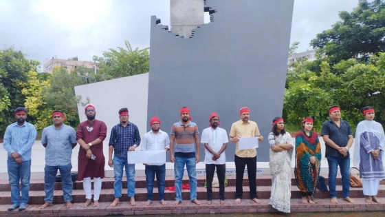 শনিবার (৩ আগস্ট) বিশ্ববিদ্যালয়ের কেন্দ্রীয় শহীদ মিনারের পাদদেশে মাথায় লাল কাপড় বেঁধে মানববন্ধন ও অবস্থান কর্মসূচি করেন তারা।
