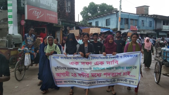 এতে বক্তারা বলেন, কলেজের অধ্যক্ষ অদ্রিশ আদিত্য মণ্ডল একজন দুর্নীতিবাজ শিক্ষক, তার অত্যাচারে অতিষ্ঠ কলেজের শিক্ষক-কর্মচারী ও শিক্ষার্থীরা। তার বিরুদ্ধে রয়েছে নানা অনিয়মের অভিযোগ। যে কারণে তাকে আগামী ২৪ ঘণ্টার মধ্যে পদত্যাগের দাবি জানান শিক্ষার্থীরা। বক্তব্য দেন শিক্ষকদের পক্ষে কলেজর ইংরেজি প্রভাষক রেজওয়ানুল করিম, শিক্ষার্থী প্রিন্স, নাহিদ, তৃষা, রাসেল, মেহেদী, সোহেল, সাব্বির প্রমুখ।