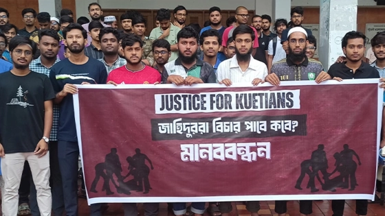 ৫ দফা দাবিতে JUSTICE FOR KUETIANS এই স্লোগানকে সামনে রেখে খুলনা প্রকৌশল ও প্রযুক্তি বিশ্ববিদ্যালয় (কুয়েট)’র সাধারণ শিক্ষার্থীরা ক্যাম্পাসে বিক্ষোভ মিছিল ও মানববন্ধন করেছে।