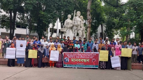 রবিবার (৮ সেপ্টেম্বর) সকাল ১০টায় ঢাকা বিশ্ববিদ্যালয়ের অপরাজেয় বাংলার পাদদেশে এ মানববন্ধন করেন শিক্ষার্থীরা। মানববন্ধন শেষে ক্যাম্পাসে একটি বিক্ষোভ মিছিল করেন তারা।