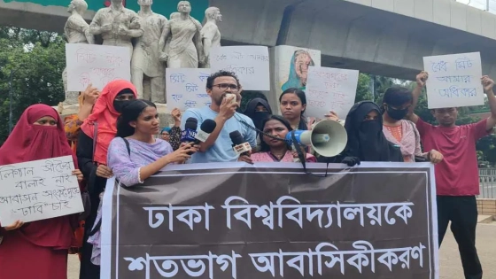 ঢাকা বিশ্ববিদ্যালয়কে (ঢাবি) শতভাগ আবাসিকীকরণ, ১ম বর্ষের ১ম দিন থেকেই সিট প্রদান, মেয়েদের হল সংস্কার ও সংখ্যা বাড়ানো এবং হলের আশপাশের নিরাপত্তা জোরদারের দাবিতে মানববন্ধন করেন শিক্ষার্থীরা।