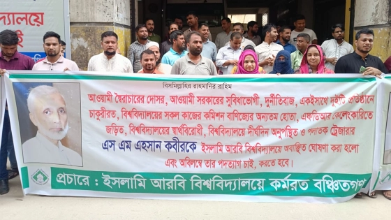 আওয়ামী লীগ সরকারের সময় নিয়োগ পাওয়া ইলেকশন মনিটরিং ফোরামের পরিচালক, দুর্নীতিবাজ, ঘুষখোর ইসলামি আরবি বিশ্ববিদ্যালয়ের (ইআবি) উপউপাচার্য অধ্যাপক ড. আবুল কালাম আজাদ এবং বিশ্ববিদ্যালয়ের কোষাধ্যক্ষ এস এম এহসান কবীরের পদত্যাগের দাবিতে বিশ্ববিদ্যালয় ক্যাম্পাসে মানববন্ধন করেছেন বৈষম্যের শিকার শিক্ষক ও কর্মকর্তা-কর্মচারীরা।