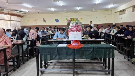 বৈষম্যবিরোধী ছাত্র আন্দোলনে জগন্নাথ বিশ্ববিদ্যালয়ের শহীদ শিক্ষার্থী ইকরামুল হক সাজিদের স্মরণে পরীক্ষার হলে একটি আসন ফাঁকা রাখেন তার সহপাঠীরা। সাজিদের স্মরণে তার বন্ধুরা বেঞ্চটিতে রেখে দিয়েছেন একগুচ্ছ তাজা ফুল আর টেবিলটি ঢেকে রাখা হয় বাংলাদেশের জাতীয় পতাকা দিয়ে।