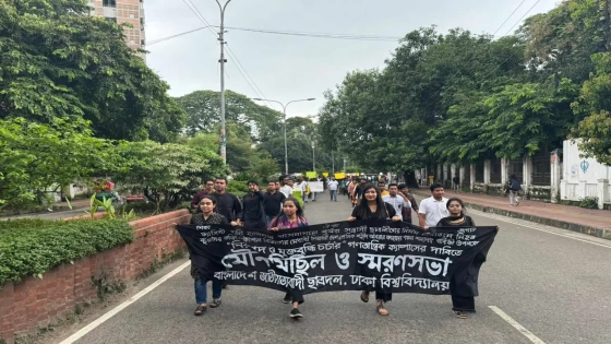 সোমবার (৭ অক্টোবর) দুপুরে এ কর্মসূচির আয়োজন করে সংগঠনটি। এই মৌন মিছিল কেন্দ্রীয় শহীদ মিনার থেকে শুরু হয়ে কার্জন হল ও দোয়েল চত্বর হয়ে ঢাকা বিশ্ববিদ্যালয় ক্যাম্পাসের গুরুত্বপূর্ণ পয়েন্ট প্রদক্ষিণ করে।