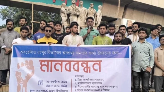 উত্তরবঙ্গের রংপুর বিভাগ থেকে একজন উপদেষ্টা নিয়োগ ও তিস্তা মহাপরিকল্পনা বাস্তবায়নসহ ৫ দফা দাবিতে মানববন্ধন কর্মসূচি পালন করেছে রংপুর বিভাগের সাধারণ ছাত্র-জনতা।