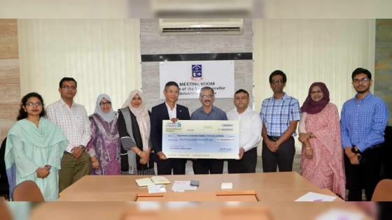 ঢাকা বিশ্ববিদ্যালয়ের (ঢাবি) জাপানিজ স্টাডিজ বিভাগে ভার্চুয়াল ক্লাসরুম প্রতিষ্ঠা এবং দক্ষতা উন্নয়ন প্রশিক্ষণ কর্মসূচি পরিচালনার লক্ষ্যে জাপানের মিতসুবিশি করপোরেশন বাংলাদেশের কান্ট্রি রিপ্রেজেন্টেটিভ মি. হিরোশি উয়েগাকি ৩৪ লাখ টাকার একটি চেক প্রদান করেছেন।