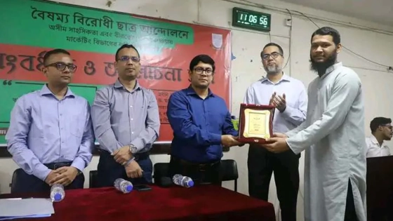অনুষ্ঠানে বৈষম্যবিরোধী ছাত্র আন্দোলনে অসীম সাহসিকতা এবং বীরত্বের পরিচয় দেওয়া মার্কেটিং বিভাগের ১৫তম ব্যাচের শিক্ষার্থী তুষার শেখ ও মো. রিয়াদ হোসেন তাদের উপর হওয়া জুলুম এবং অন্যায়ের কথা তুলে ধরেন।