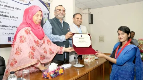 স্নাতক (সম্মান) পরীক্ষায় সর্বোচ্চ সিজিপিএ অর্জন করায় ঢাকা বিশ্ববিদ্যালয় (ঢাবি) পরিসংখ্যান গবেষণা ও শিক্ষণ ইনস্টিটিউট (আইএসআরটি)-এর মাস্টার্সের শিক্ষার্থী ফারিয়া রউফ রিয়া ‘আইএসআরটি সুবর্ণজয়ন্তী পদক- ২০২৪’ লাভ করেছেন।