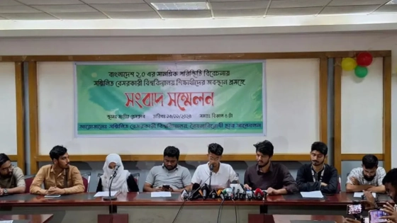 বুধবার (১৩ নভেম্বর) বিকেলে জাতীয় প্রেস ক্লাবের তফাজ্জল হোসেন মানিক মিয়া হলে ‘বাংলাদেশ ২.০ এর সামগ্রিক পরিস্থিতি বিবেচনায় সম্মিলিত বেসরকারি বিশ্ববিদ্যালয় শিক্ষার্থীদের অবস্থান’ শীর্ষক সংবাদ সম্মেলনে এ দাবি জানানো হয়।