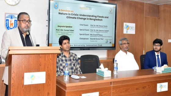 বুধবার (৪ ডিসেম্বর) বিশ্ববিদ্যালয় ইনোভেশন ক্লাবের উদ্যোগে ‘ইনভেন্টাম ৩.০’ উপলক্ষে ‘ন্যাচার ইন ক্রাইসিস : আন্ডারস্ট্যান্ডিং ফ্লাডস্ অ্যান্ড ক্লাইমেট চেঞ্জ ইন বাংলাদেশ’ শীর্ষক এক সেমিনারে তিনি এসব কথা বলেন।