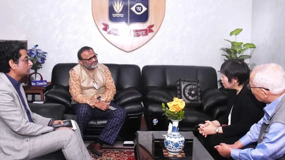 জাপান এক্সটারনাল ট্রেড অর্গানাইজেশনের ইনস্টিটিউট অব ডেভেলপিং ইকোনমিক্সের (আইডিই) নির্বাহী ভাইস প্রেসিডেন্ট মি. মুরায়ামা মায়ুমি ঢাকা বিশ্ববিদ্যালয়ের উপাচার্য অধ্যাপক ড. নিয়াজ আহমদ খানের সঙ্গে তার কার্যালয়ে সাক্ষাৎ করেছেন।
